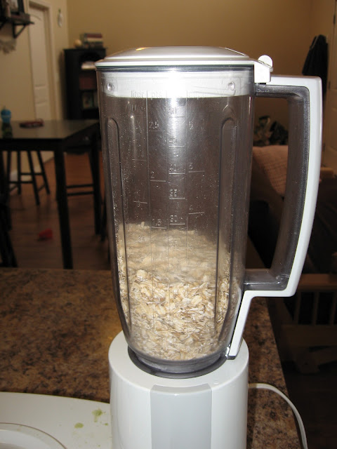 Step 1: Measure out the rolled oats into the blender. Process on low until powdery. (In case you are wondering about the splotches on my my Bosch, it happens to be some of the green beans I pureed for Noah a while ago. And yes, I was too lazy to clean it off.)